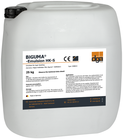 BIGUMA®- Emulsion PMB 60-S is a type C60BP4-S bituminous polymer emulsion used for layer bonding in accordance with TL BE-StB 15. This emulsion is intended for construction classes SV and I to III according to the supplementary technical conditions of contract and guidelines for the construction of asphalt road surfaces (ZTV Asphalt-StB 07).