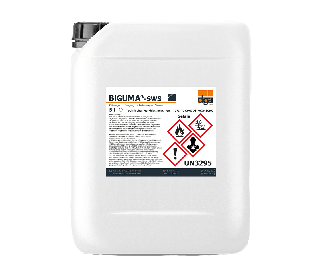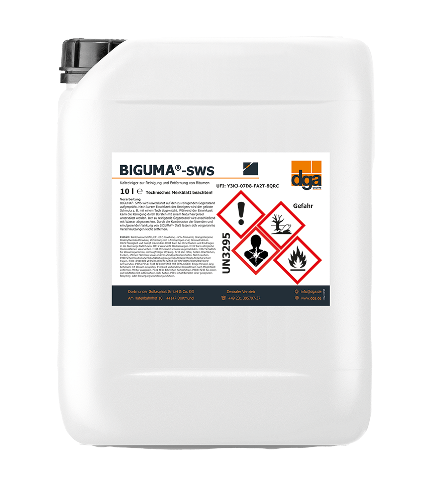 BIGUMA®- SWS is ideal for removing unwanted bitumen thanks to its dissolving and emulsifying effect. BIGUMA®- SWS is sprayed undiluted onto the object to be cleaned, wiped off with a cloth after a short while and then washed off with water. Once the product has been applied, a brush made of natural hair can also be used to assist with cleaning.