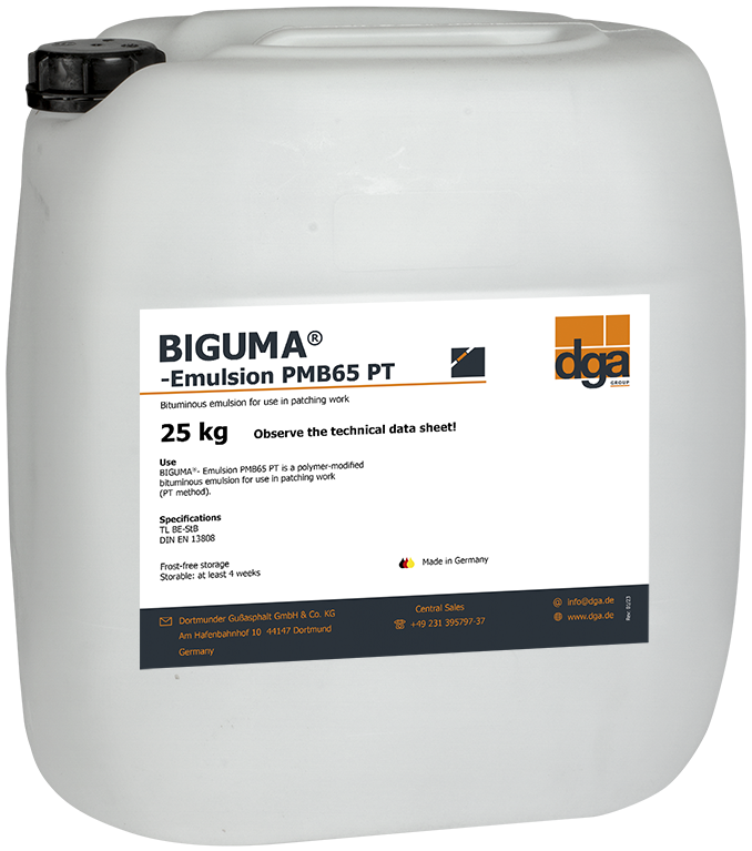 BIGUMA®- Emulsion PMB65 PT est certifiée comme émulsion de bitume cationique C67BP3-REP selon le cadre national TL BE-StB 15 et la norme européenne harmonisée DIN EN 13808.