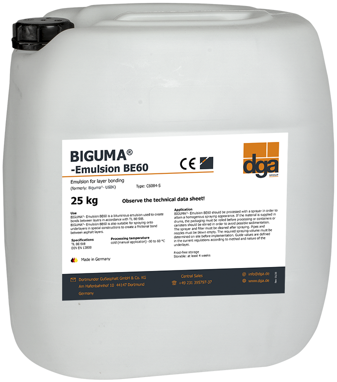 BIGUMA®- Emulsion BE60 is een bitumenemulsie voor het tot stand brengen van de verbinding van lagen conform TL BE-StB 15. Deze emulsie is ook geschikt voor het aanspuiten van de onderlaag bij speciale constructies voor het maken van een krachtgesloten verbinding tussen asfaltlagen.