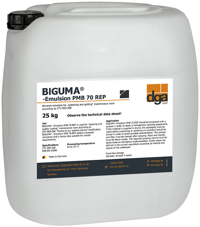 BIGUMA®- Emulsion PMB 70 REP применяется для ремонтных работ способом «присыпка и обсыпка» согласно ZTV BEA-StB 09/13. Благодаря нашей особенной полимерной модификации Biguma®- Emulsion PMB 70 REP достигает повышенной прочности и поэтому отлично подходит для высоких требований. BIGUMA®- Emulsion PMB 70 REP прошла сертификацию как катионная битумная эмульсия C67B3-REP согласно национальным Условиям TL BE-StB 15 и соглашенным европейским нормам DIN EN 13808.