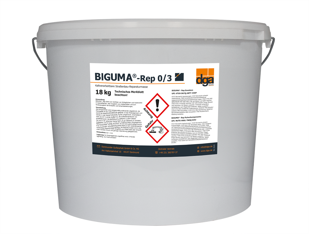 Для быстрого заполнения выбоин и воронок в асфальтобетонных покрытиях мы разработали BIGUMA®- Rep. Данная мастика предназначена для ремонта холодного применения и ее можно быстро и беспроблемно смешать прямо на строительной площадке. Благодаря своему многокомпонентному составу она особенно быстро затвердевает. Мы предлагаем BIGUMA®- Rep разной фракции.